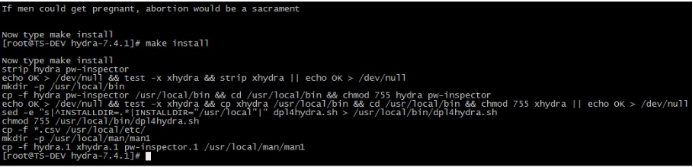 # yum install cmake # cd /usr/local/src # wget http://www.libssh.org/files/0.4/libssh-0.4.8.tar.gz # tar zxf libssh-0.4.8.tar.gz # cd libssh-0.4.8 # mkdir build # cd build # cmake -DCMAKE_INSTALL_PREFIX=/usr -DCMAKE_BUILD_TYPE=Debug -DWITH_SSH1=ON .. # make # make install # /sbin/ldconfig //要执行这句,不然会出现hydra: error while loading shared libraries: libssh.so.4: cannot open shared object file: No such file or directory # cd /usr/local/src # wget http://freeworld.thc.org/releases/hydra-6.3-src.tar.gz # tar zxf hydra-6.3-src.tar.gz # cd hydra-6.3-src # ./configure # make # make install