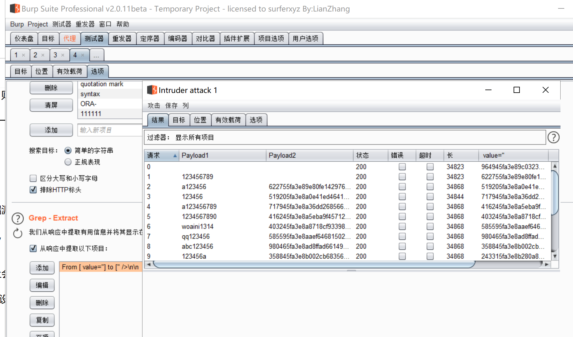 注意:破解方式为音叉;线程数设为1;Grep-Extract设置好开始token" value=" 结束为" /> ;token字典的有郊载荷设为递归搜索