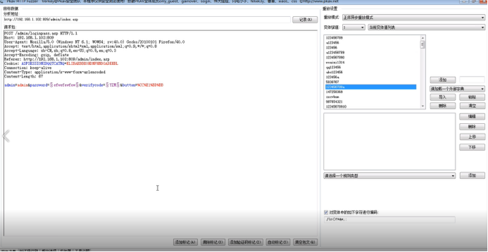 1、输入正确验证码后进行抓包,对用户名和密码进行暴力破解