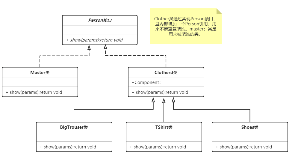 关键讲解:装饰者实现的关键在于所有装饰类和被装饰类都是实现了同一个接口!!!这样子才能都通过一个内部Person引用来层层的装饰。当然show的方法的实现也很讲究,每次都会调用p.show方法使得,逐层的展示每次的装饰结果。