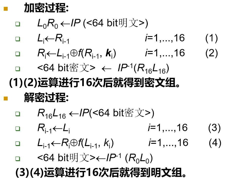 DES:分组长度/密钥长度;Feistel结构(分左右两半去做);S盒;混淆vs扩散。
