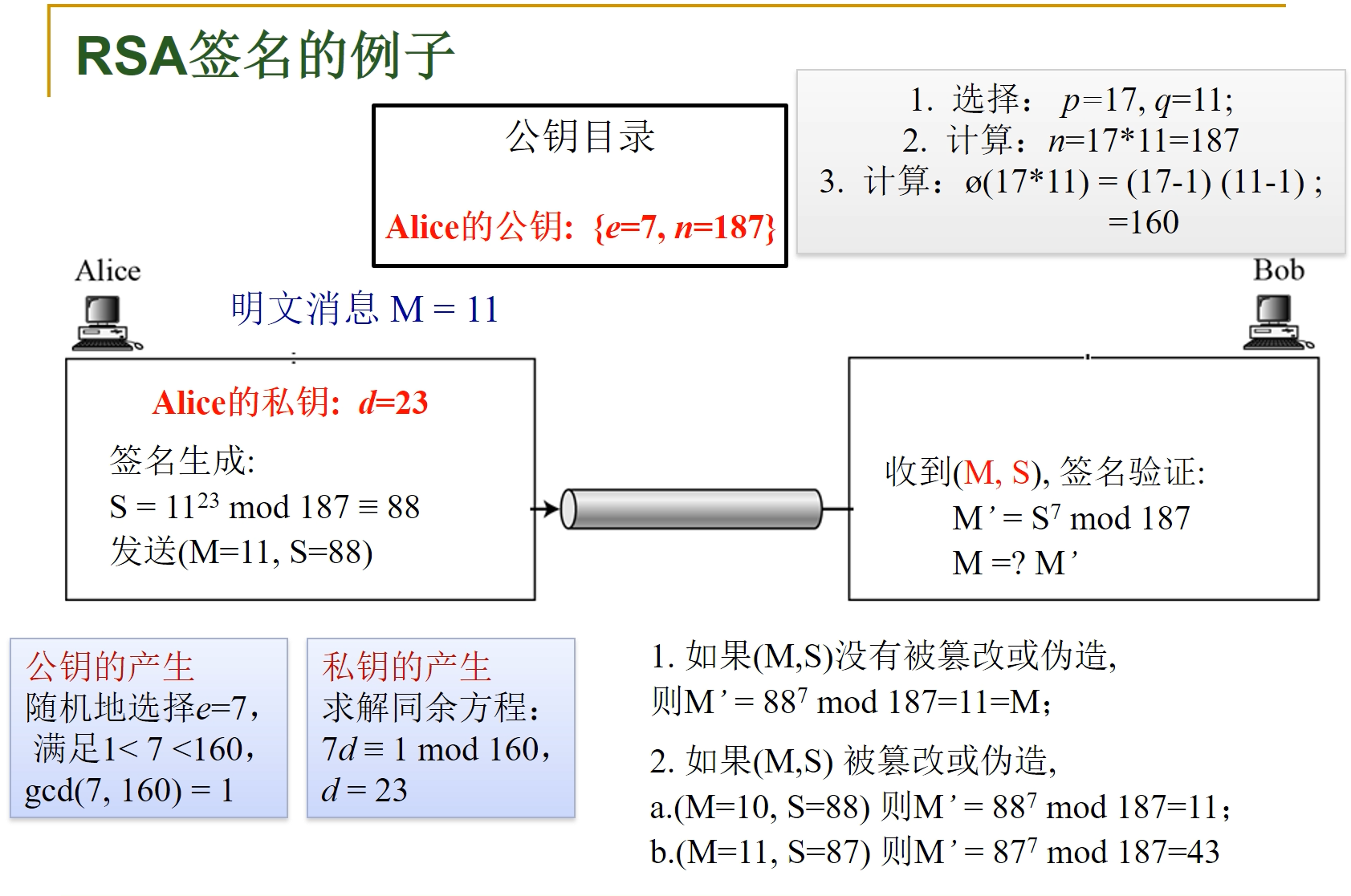 n=p*q=187,φ(n)=(p-1) *(q-1)=160,B的公钥是{e=7,n=187}.