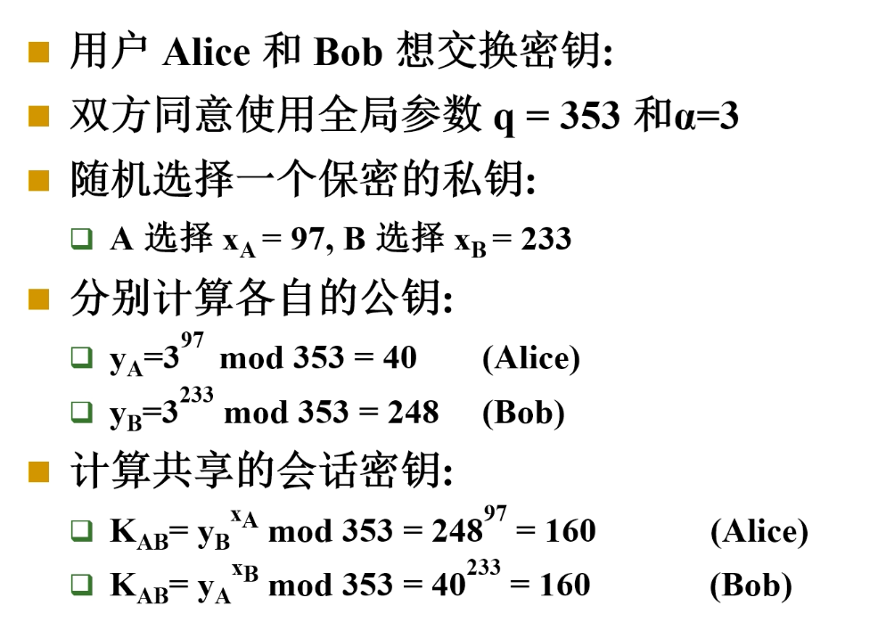 DH密钥交换,协议流程——会计算,离散对数问题,中间人攻击——缺少消息完整性保护,改进:SIG-DH(比较流行)、MAC-DH