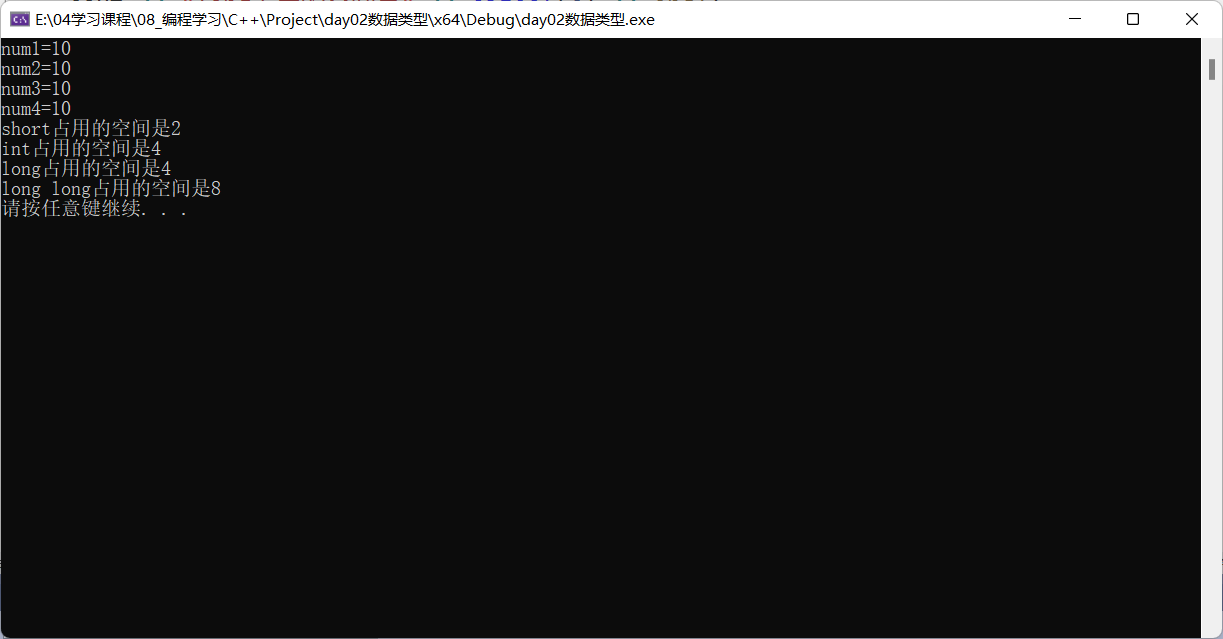 | long long(长长整型) | 8字节 | (-263~263-1) |