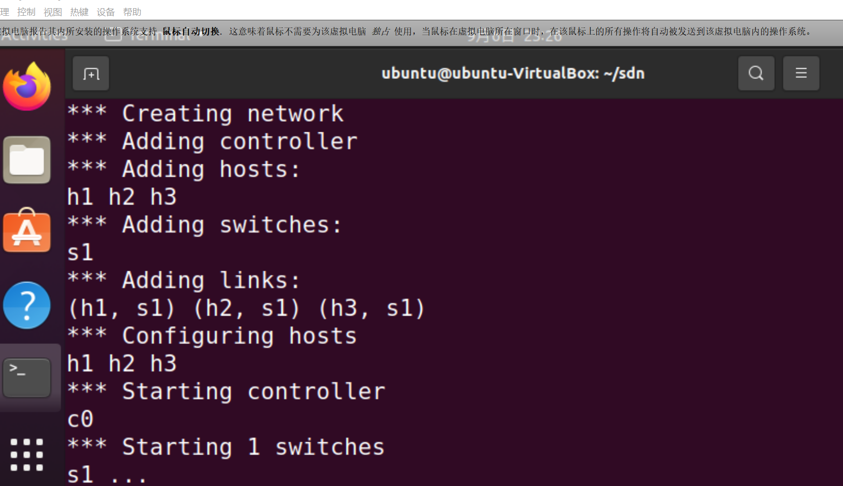 这是第一次用虚拟机做实验,在安装是遇到不少难题,有在mininet下载不了,不能神秘git等等,在同学的帮助和自己的尝试下才顺利通过,在做实验时有在打代码时因为没有区分大小写而错误,有在没有打小数点错误,所以,做什么都要细心和耐心,在后续的学习中要好好掌握好技能,不懂得要及时问同学或老师,这次实验我也开始了解虚拟机的操作,动手能力也提升了,对这门课有了不少的兴趣