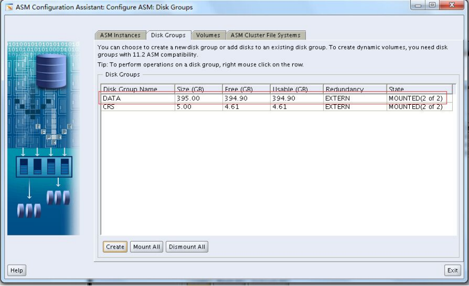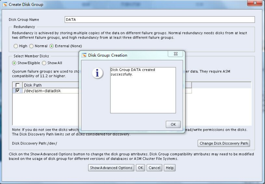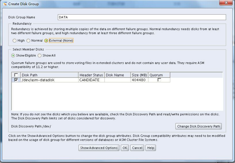 命名存放数据盘为DATA,对应磁盘设备/dev/asm-datadisk,选择外部镜像: