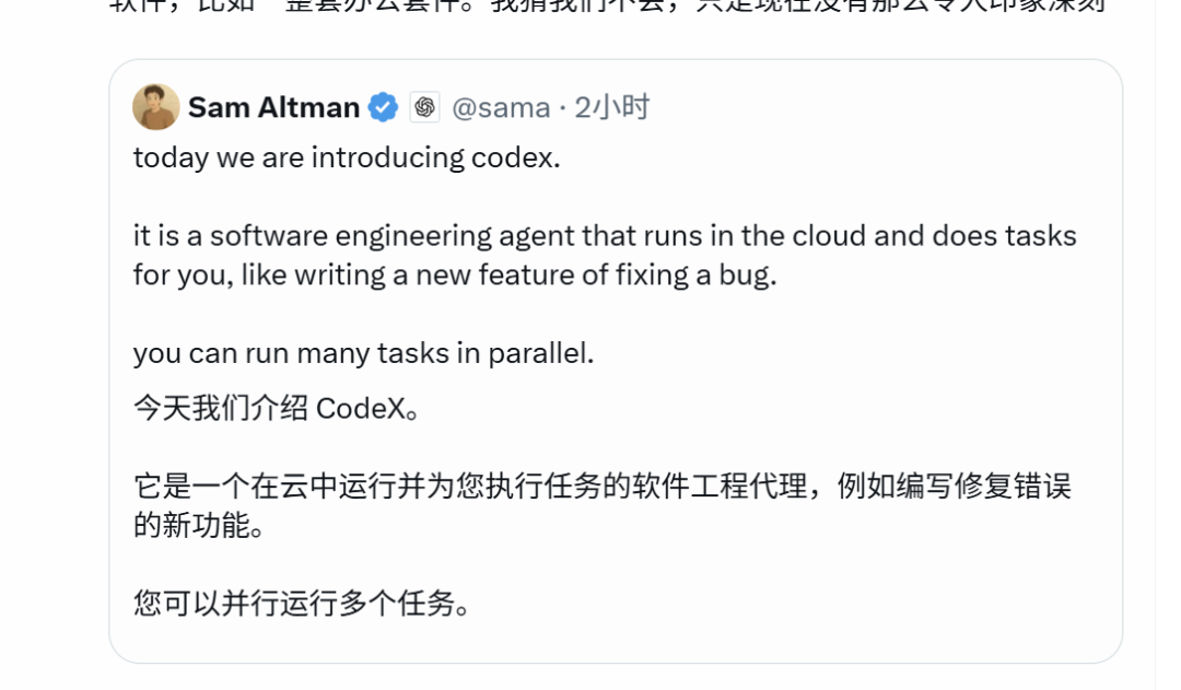 OpenAI CEO Sam Altman对Codex给予了高度评价:"令人惊奇和兴奋的是,一个人就能利用这样的工具创建出丰富的软件。"这句话也许揭示了未来软件开发的新范式。