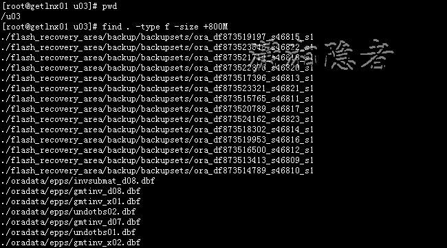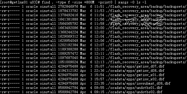 [root@getlnx01 u03]# find . -type f -size +800M -print0 | xargs -0 ls -l