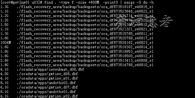 [root@getlnx01 u03]# find . -type f -size +800M -print0 | xargs -0 du -h