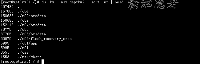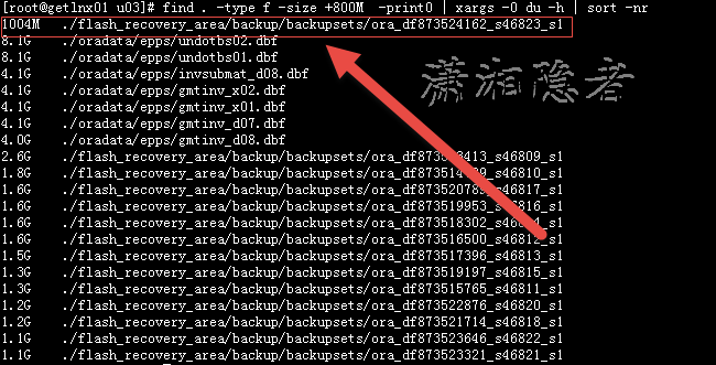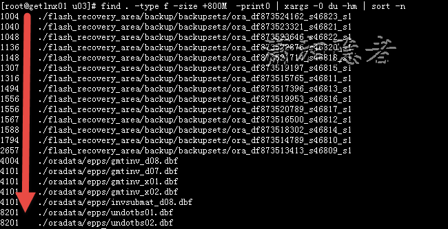 如果你想知道flash_recovery_area目录下面有哪些大文件夹,那么可以将参数max-depth=2 ,或者进入对应目录下进行执行上述命令,如果你想对搜索出来的结果进行排序,那么可以借助于sort命令。如下所示