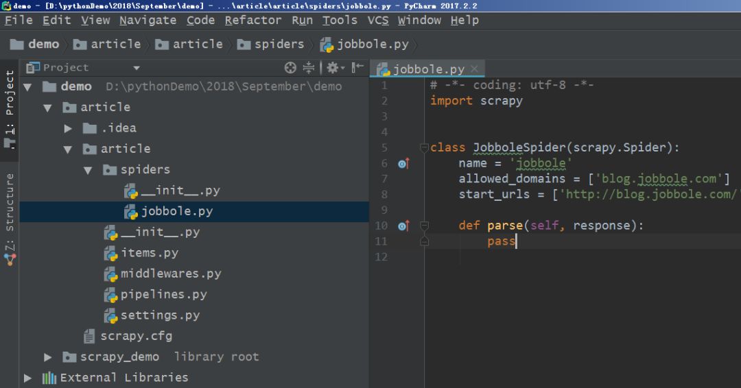 点击jobbole.py文件进行查看内容,如下图所示。可以看到该文件已经默认的填充了部分Python代码,其实是从源模板中进行复制创建的。