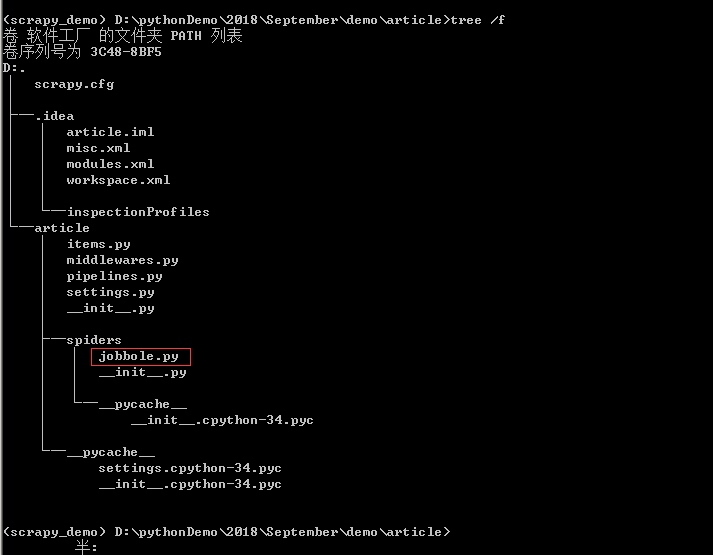 根据提示,该模板创建的位置为article.spiders.jobbole,此时再次输入tree /f命令可以查看到除了之前创建Scrapy爬虫项目的基础文件之外,在spiders文件夹下确实是多了一个jobbole.py文件,如下图所示。