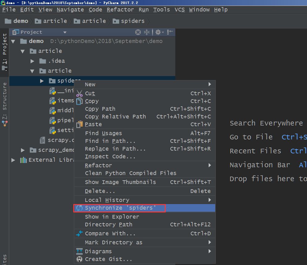 如果在Pycharm中的spiders文件夹下看不到jobbole.py这个文件的话,则先选中spiders文件夹,尔后右键,点击“Synchronize spider”,代表与spiders文件夹进行同步的意思,尔后便可以看到jobbole.py就会被加载出来。
