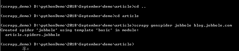 在我们创建好Scrapy爬虫项目之后,会得到上图中的提示,大意是让我们直接根据模板进行创建Scrapy项目。根据提示,我们首先运行“cd article”命令,意思是打开或者进入到article文件夹下,尔后执行命令“scrapy genspider jobbole blog.jobbole.com”,代表通过Scrapy中自带的basic模板进行创建Scrapy项目,如下图所示。