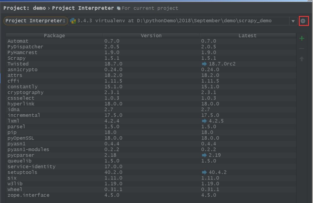 如果“Project Interpreter”显示出来的解释器不是当前项目下的虚拟环境,则点击“Project Interpreter”的右侧的设置按钮,如下图所示。