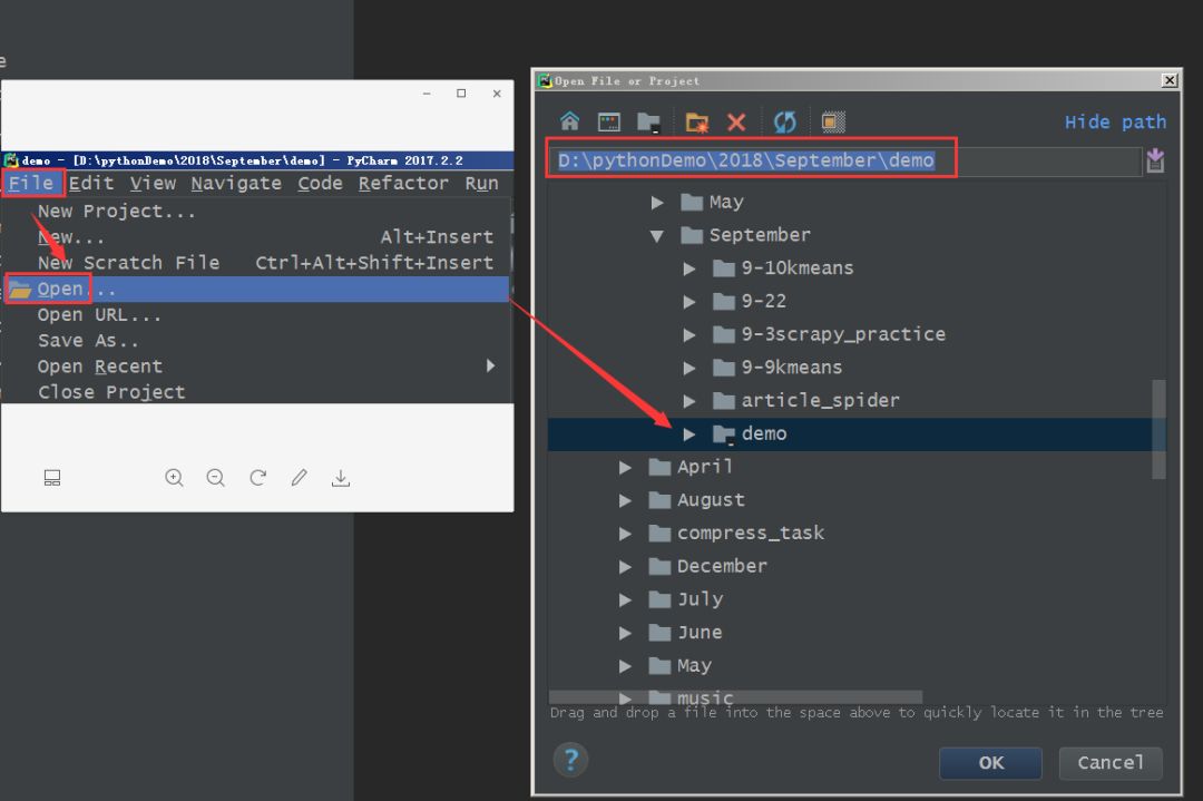 接下来,将整个爬虫项目导入到Pycharm中去,点击左上方“file”à“open”,找到爬虫项目创建的文件夹,点击确认即可。