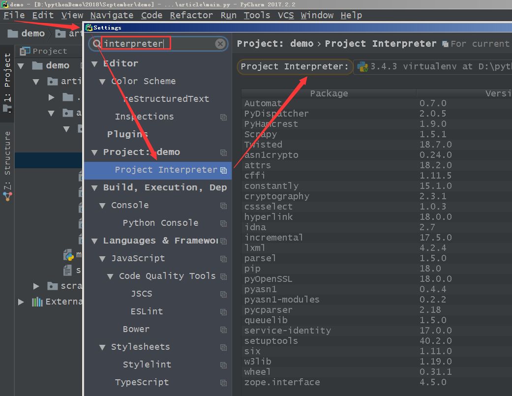 接下来最后检查一下该项目的Python解释器,点击Pycharm的setting,然后输入“interpreter”,找到解释器所在的位置,如下图所示。