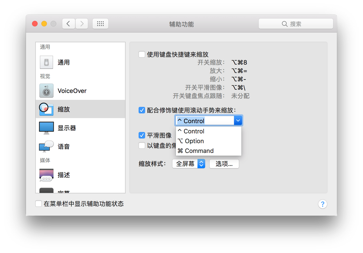 设置:点击左上角苹果logo「」->「系统偏好设置」->「辅助功能」->选择「缩放」->勾选「配合修饰键使用滚动手势来缩放」
