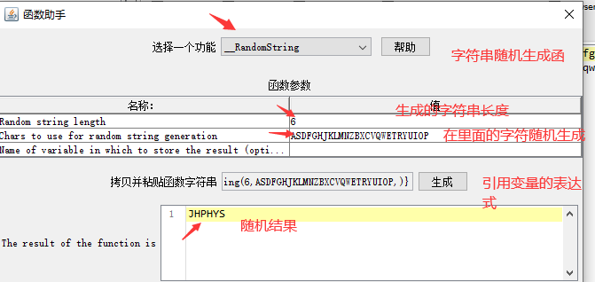 在jmeter的选项中选择函数助手对话框 选择 __RandomString函数 进行如下设置 目的是为了生成随机用户