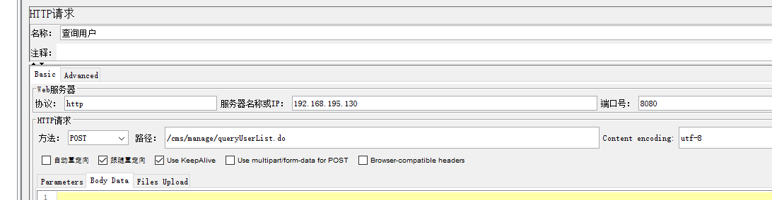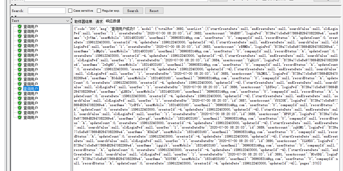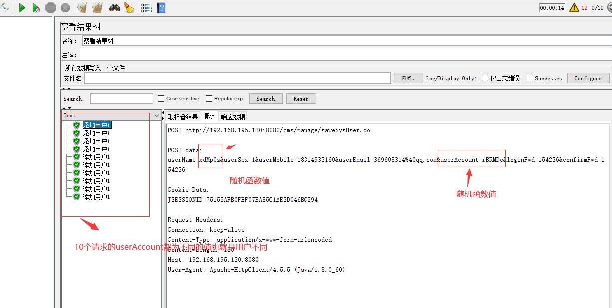 body Data:传入 userName=${__RandomString(5,QWERTYUIOPLKJHGFDSAZXCVBNMqwertyiopasdfghjklmnbvcxz1234567890,)}&userSex=1&userMobile=18314933160&userEmail=369608314%40qq.com&userAccount=${__RandomString(5,QWERTYUIOPLKJHGFDSAZXCVBNMqwertyiopasdfghjklmnbvcxz1234567890,)}&loginPwd=154236&confirmPwd=154236
