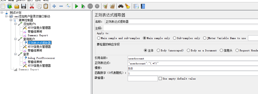 添加正则表达式获取查询到的userAccount的值 具体设置如下