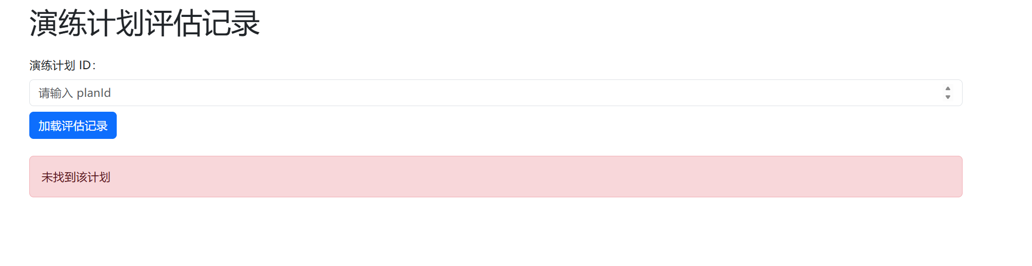 5.最新做好的功能 (1)实现演练评估反馈模块的第一阶段功能 输入计划ID查找对应的计划: 若未输入计划ID或者输入的计划ID不存在会提示未找到该计划 输入存在的计划ID,加载其评估结果