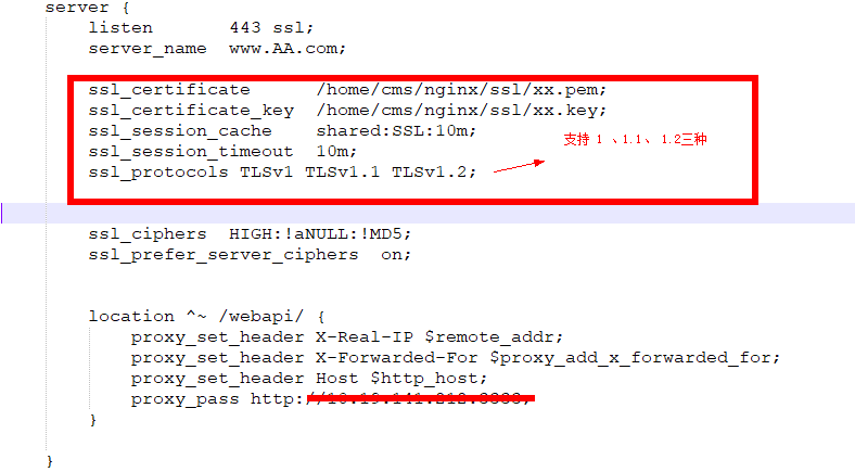 2、需要支持Https协议访问,已经在nginx上配置了证书,并且设置了TLS协议等信息,如下: