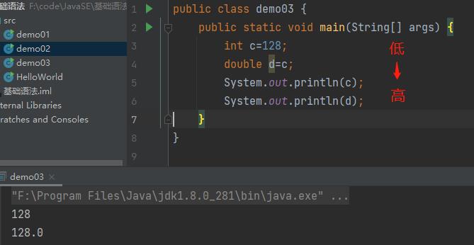 强制类型转换 从高到低 格式为:(转换类型)变量名