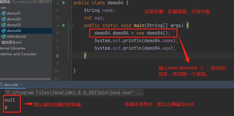 实例变量:在量里面、方法的外面,从属于对象。布尔值默认false
