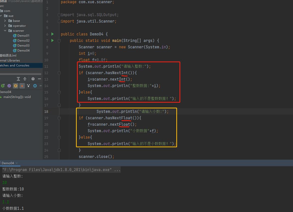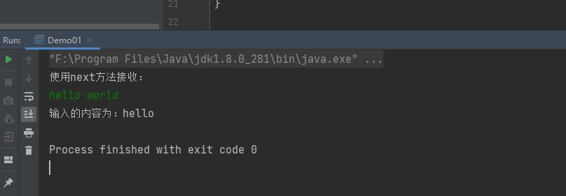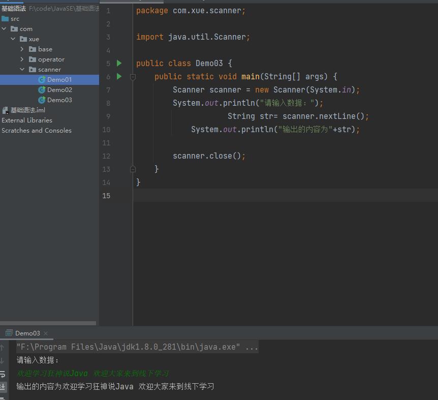 通过Scanner类的next()与nextline()方法获取输入的字符串,在读取前我们一般需要使用hasNext()与hasNextline()判断是否还有输入的数据。