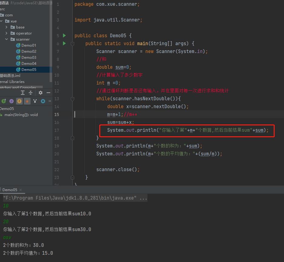 我们可以输入多个数字,并求其总和与平均值,每输入一个数字用回车确认,通过输入非数字来结束输入并输出执行结果。