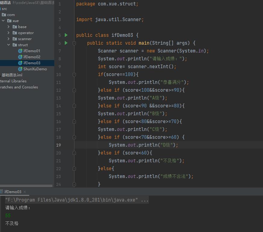 我们发现刚才的代码不符合实际情况,真实情况还可能存在ABCD,存在区间多级判断。比如90-100就是A,80-90就是B....等等,在生活中我们很多时候的选择也不仅仅只有两个,所以我们需要一个多选择结构来处理这类问题。