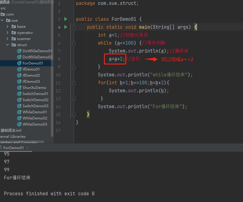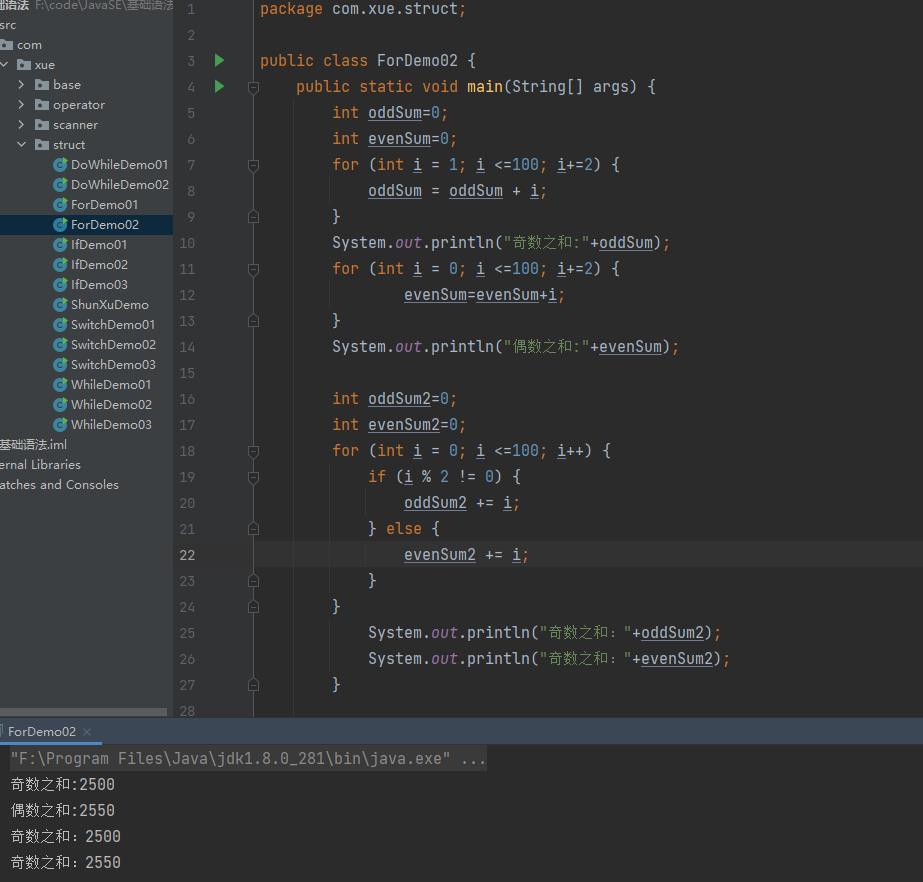 练习1:计算0到100之间的奇数和偶数的和。
