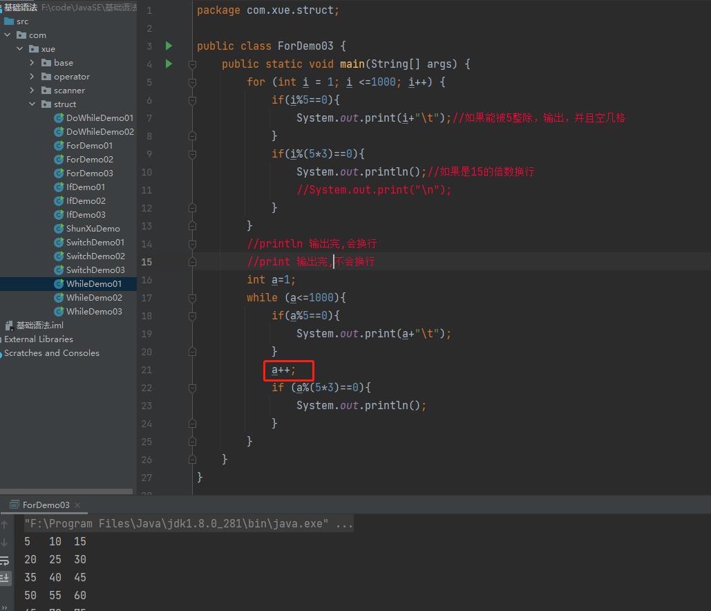 练习2:用while或for循环输出1-1000之间能被5整除的数,并且每行输出3个。