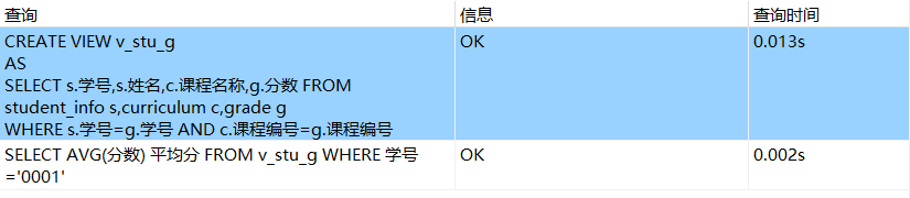 8.基于student_info表、curriculum表和grade表,建立一个名为v_stu_g的视图,视图包括所有学生的学号、姓名、课程名称、分数。使用视图v_stu_g查询学号为0001的学生的课程平均分。