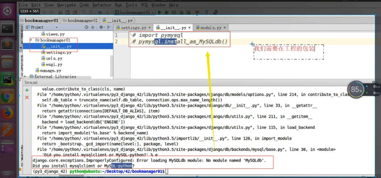 中更改引擎,之后要安装pymysql,在命令行中执行 pip install PyMySQL。然后在项目的init.py中前面加上.