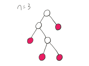接下来让我们观察一下 n = 3 的一种出栈序列:+1 -1 -1 +1 -1 +1。序列前三项和小于 0,显然这是个非法的序列。