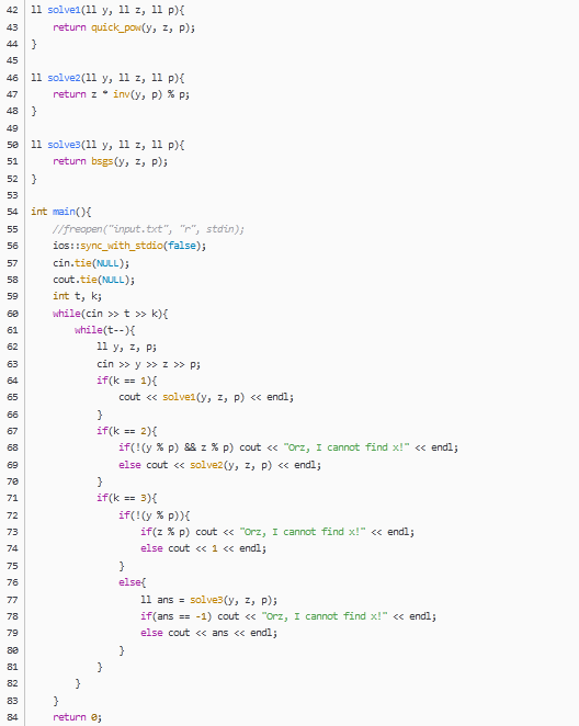 如果x有解,x一定可以表示成i*m+j(0≤i,j≤m-1),从小到大枚举i,ai*m+j=(am)i*aj,(am)i的值易求,(am)i*aj≡b(mod c)中aj mod c的值v可以用扩展欧几里得来求,也可以根据欧拉定理得v=aφ(c)-i*m*b mod c,因为a与c互质,v的值只有一个