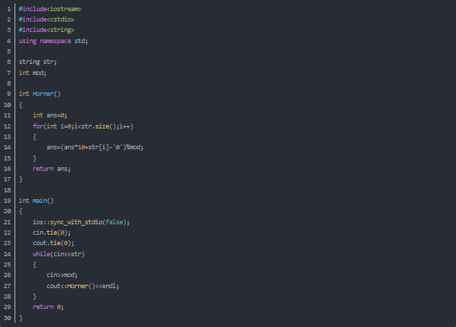 给你一个长度不超过1000的大数A,还有一个数值不超过100000的B,快速求A % B。