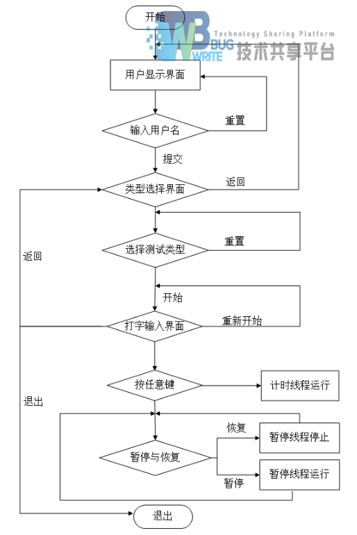 程序启动后进入用户显示界面,输入用户名后可进入类型选择界面,设置完成后就进入打字模块,按任意键就进入打字练习并开始启动及计时线程进行计时及打字状态的显示。详细的程序流程图如下所示:
