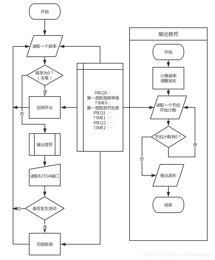控制:通过将8255模块,设置为方式0,A端口输入,10010000B,作为控制器。通过读取A端口输入的数据来选择相应的歌曲。每次读取到的数据存入寄存器,与下次读取到的做对比,来判断是否需要切换。切换时,不同开关位状态分别代表不同歌曲,设置的三首音乐分别对应001B,010B,100B。