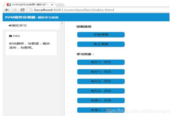 为了验证基于 SVM 分类器的动作识别系统的运用场景,本文将其运用到了智 能家居家电控制领域,通过软件搭建了一个智能家居模拟模块,可以模拟实体智能 家居的一系列状态信息(如打开电灯)。通过对用户动作数据的分类学习,可以达到 通过动作信息控制家电开关等状态动作的功能目的,为基于 SVM 分类器的动作识 别系统找到了一个应用场景。
