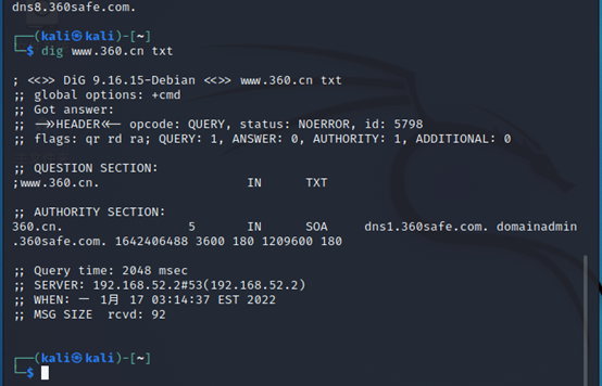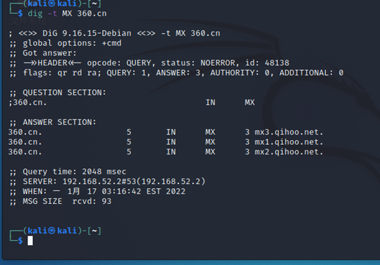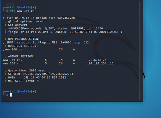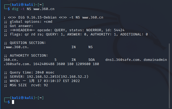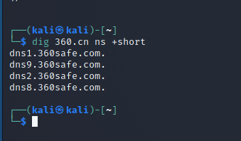 NS记录时域名服务器记录,用来指定该域名由哪个DNS服务器来进行解析:dig -t NS www.360.cn或dig 直接加域名加ns