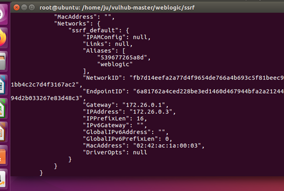 在命令行中输入docker inspect 容器id获取Weblogic的IP,容器id使用docker ps -a 查看