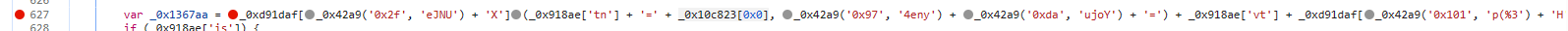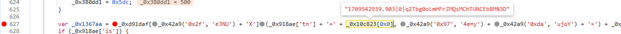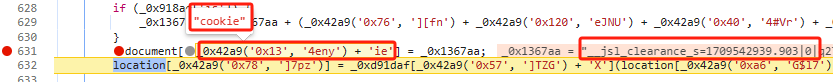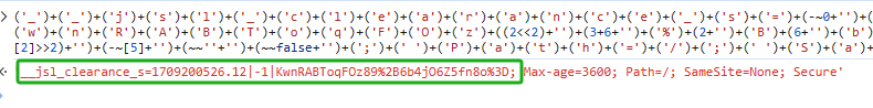 因为‘_0x1367aa’是一长串的数据('__jsl_clearance_s=1709542939.903|0|q2Tbg0oLmHFrZMQsMChTUNCEb8M%3D;Max-age=3600; path = /; SameSite=None; Secure')但我们只需要加粗部分,所以在此分析cookies关键部分是_0x10c823[0x0],