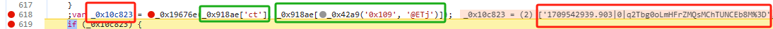 继续向上找,得知_0x10c823[0x0]是由_0x918ae['ct']与_0x918ae[_0x42a9('0x109', '@ETj')]作为参数传入_0x19676e后得到,