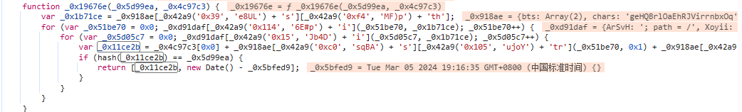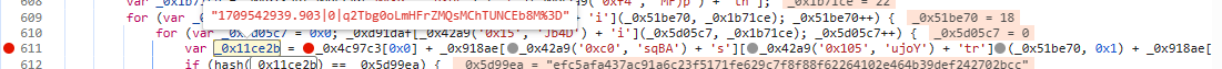 得到_0x11ce2b后下还有一段if语句,判断_0x11ce2b经过hash处理后是否与_0x5d99ea,只有相等的情况下出现的jsl_clearance_s 才会有效,经过调试分析发现hash是字典['ha']即sha256加密,反复测试字典['ha']是SHA1、SHA256、MD5,三种加密方式动态调整的,此处需自行添加hash函数,并将612行中hash修改为hash[_0x918ae['ha']]