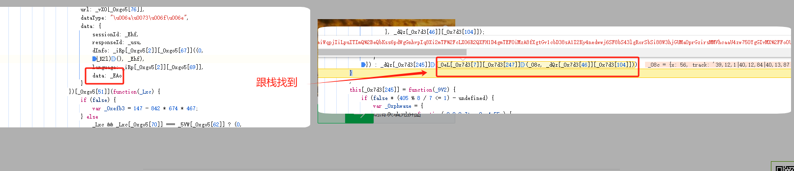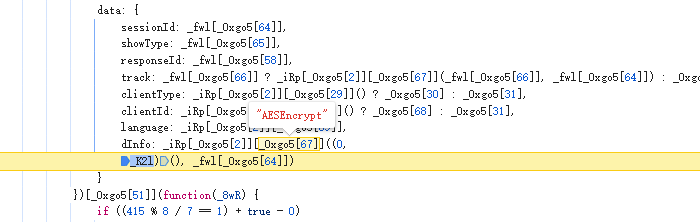 跟栈找到dInfo位置,看到是AESEncrypt,传参(0,_K2l)()可以拿输出的结果直接使用,_fwl[_0xgo5[64]]是是第一个链接拿到的sessionId值