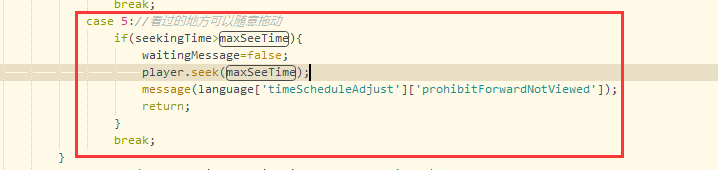 //赋值最大时间,允许跳转 maxSeeTime = vars['seek']; } if(valType(vars['seek'])=='string' && vars['seek']=='cookie' && cookieName){ var cke=player.cookie(cookieName); if(cke){ seekTime=cke['time'];